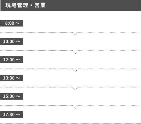 初めは先輩の補助として現場へ行き、入社から3年を目途に後輩を連れて現場へ行けるレベルを目指していきましょう。現場を任されるようになってくると達成感もひとしお。順調に仕事を覚えていけば、5年程で職長へと成長出来ます!